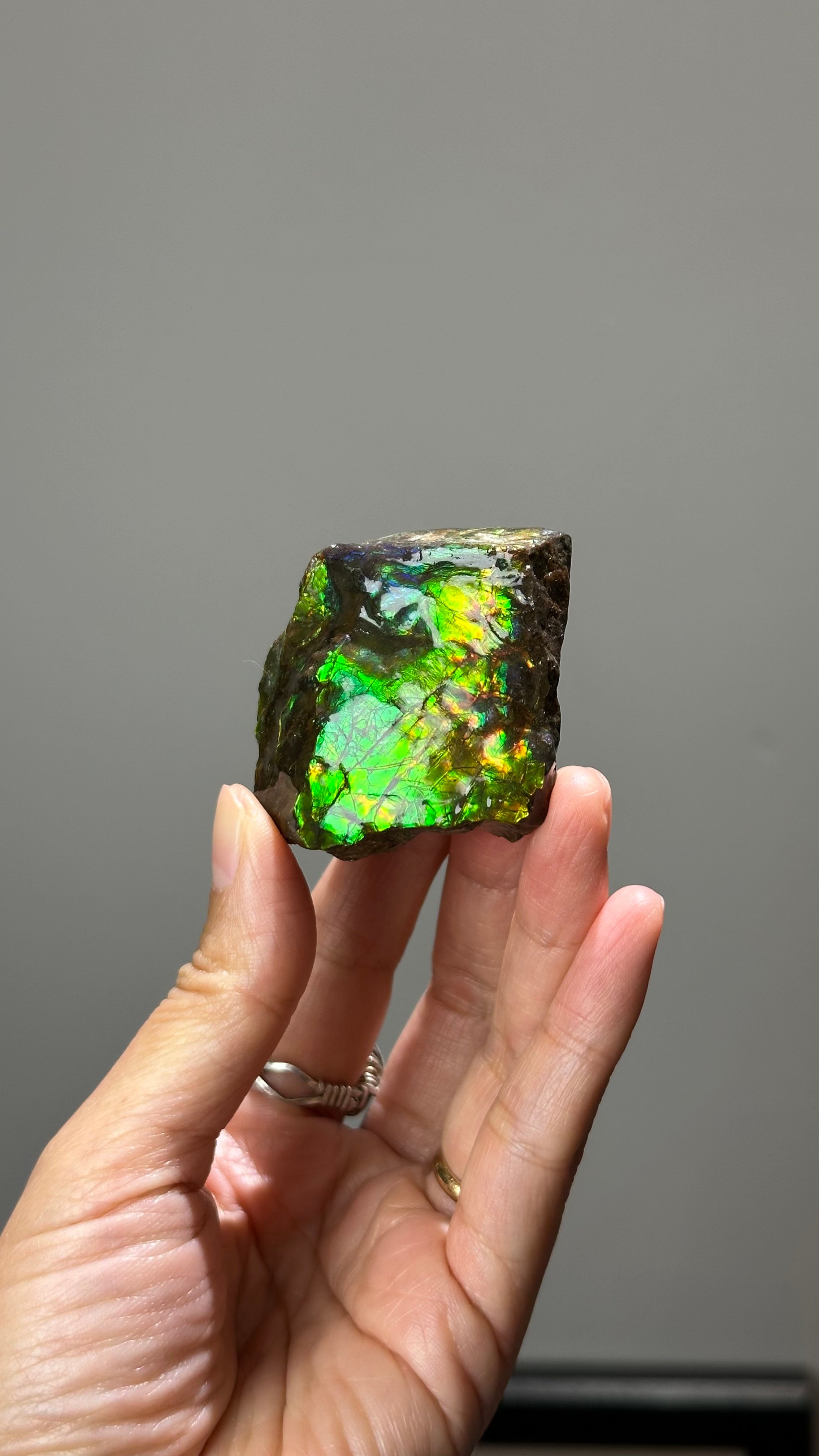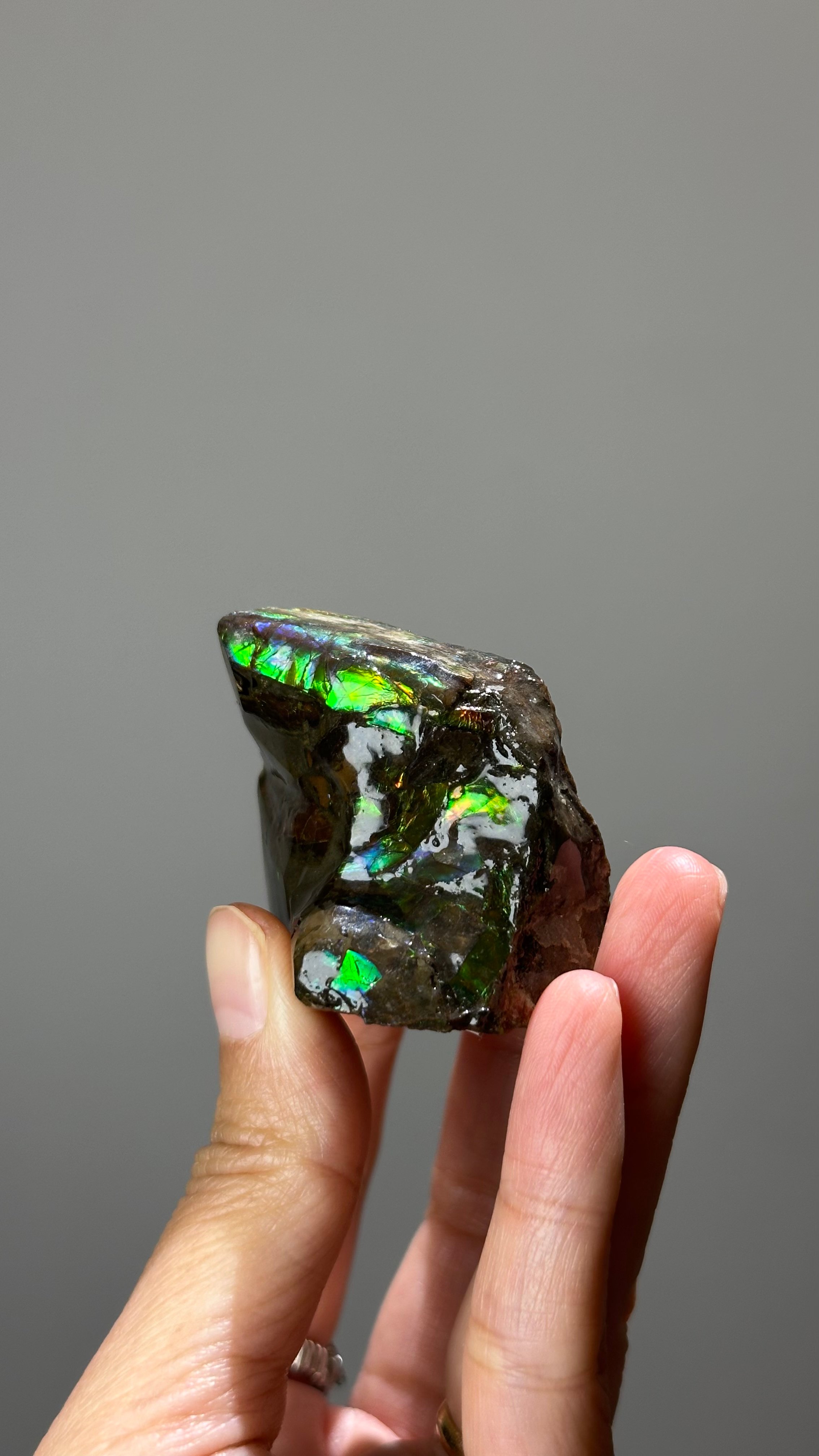 Size: 4.5 x 4.3 x 4.3cm Locality: Canada · 斑彩螺是一種化石,來自7000萬年前的海螺,經過千萬年的沉澱後形成。斑彩螺是加拿大RockyMountain聞名世界的寶石。 最早的記載來自於北美印第安人的傳說,是印第安人的神石,印第安族人都對ammolite斑彩寶石敬畏不已。 它更被公認為因吸收宇宙大地的精華及能量,所以具有非凡的治療及調節作用的稀世能量寶石。 目前能見到的斑彩石,大多來自馬達加斯加和北美地區,但國際上承認的真正寶石級斑彩石都來自加拿大。加拿大的斑彩石色彩最為豔麗,亦只有加拿大斑彩石能轉換成寶石材料。 在風水學說上,斑彩螺有招財吸財之功。