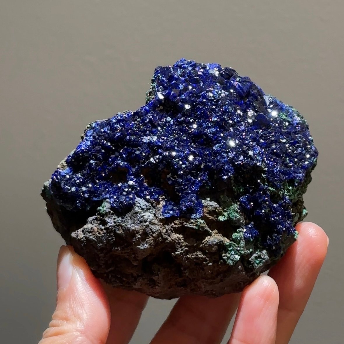 Locality: Laos - 老撾 · 【關於礦物】 名由:Azurite和天藍色Azure都來源於阿拉伯語的藍色 莫氏硬度:3.5-4 顏色:天藍色、深藍色至淡藍色 晶系:單斜 【象徵意義】 - 激活眉心輪(第三眼),幫助精神指導 - 帶來新的視角,拓展思維 - 消除壓力、擔憂和悲傷 _____________________________ 藍銅礦(azurite)是一種常見的含銅礦石,其名稱源於其深藍色的外觀。它是一種銅碳酸鹽礦物,化學結構為Cu3(CO3)2(OH)2。藍銅礦的顏色吸引了人們的注意,使其成為經常用於裝飾和藝術品的材料。 藍銅礦的產地非常廣泛,可以在世界各地的銅礦區找到。它通常與其他含銅礦物一起出現,例如綠松石和黃銅礦。藍銅礦的形成與氧化銅礦床中的含銅流體和地下水的作用有關。 藍銅礦在古代就已經被人們使用。古埃及人、古希臘人和古羅馬人都使用藍銅礦來進行藝術裝飾和顏料製作。它在中世紀歐洲的繪畫中也有廣泛的應用。藍銅礦的深藍色使其成為一種受歡迎的顏料,被稱為「天藍色」。 除了作為顏料和裝飾材料,藍銅礦還被用於製造銅。通過將藍銅礦經過熱處理,可以將其轉化為純銅或銅礦石。藍銅礦也被用於製造製導電銅和其他銅合金。 然而,由於藍銅礦中的銅含量相對較低,因此在現代銅礦業中並不常見。現代的銅開採主要集中在高銅品位礦石的開發。儘管如此,藍銅礦仍然受到礦物學家、收藏家和藝術愛好者的喜愛,並繼續在藝術和文化領域中發揮重要作用。 總結來說,藍銅礦是一種常見的含銅礦石,以其深藍色而聞名。它在藝術和裝飾領域中廣泛應用,並且在古代和中世紀的文化中佔有重要地位。儘管在現代銅礦業中並不常見,但藍銅礦仍然受到人們的喜愛,並持續在礦物學和藝術領域中發揮著重要作用。