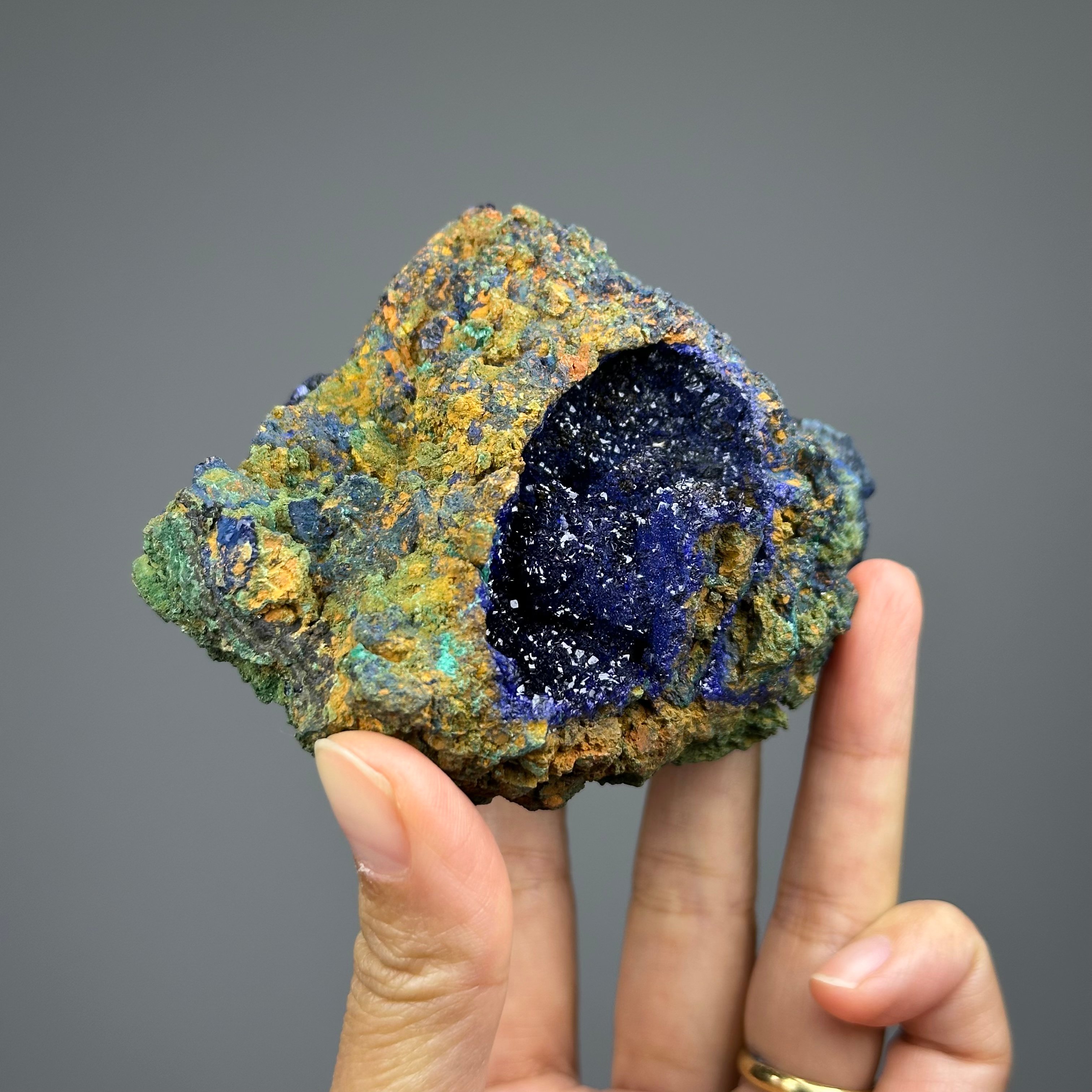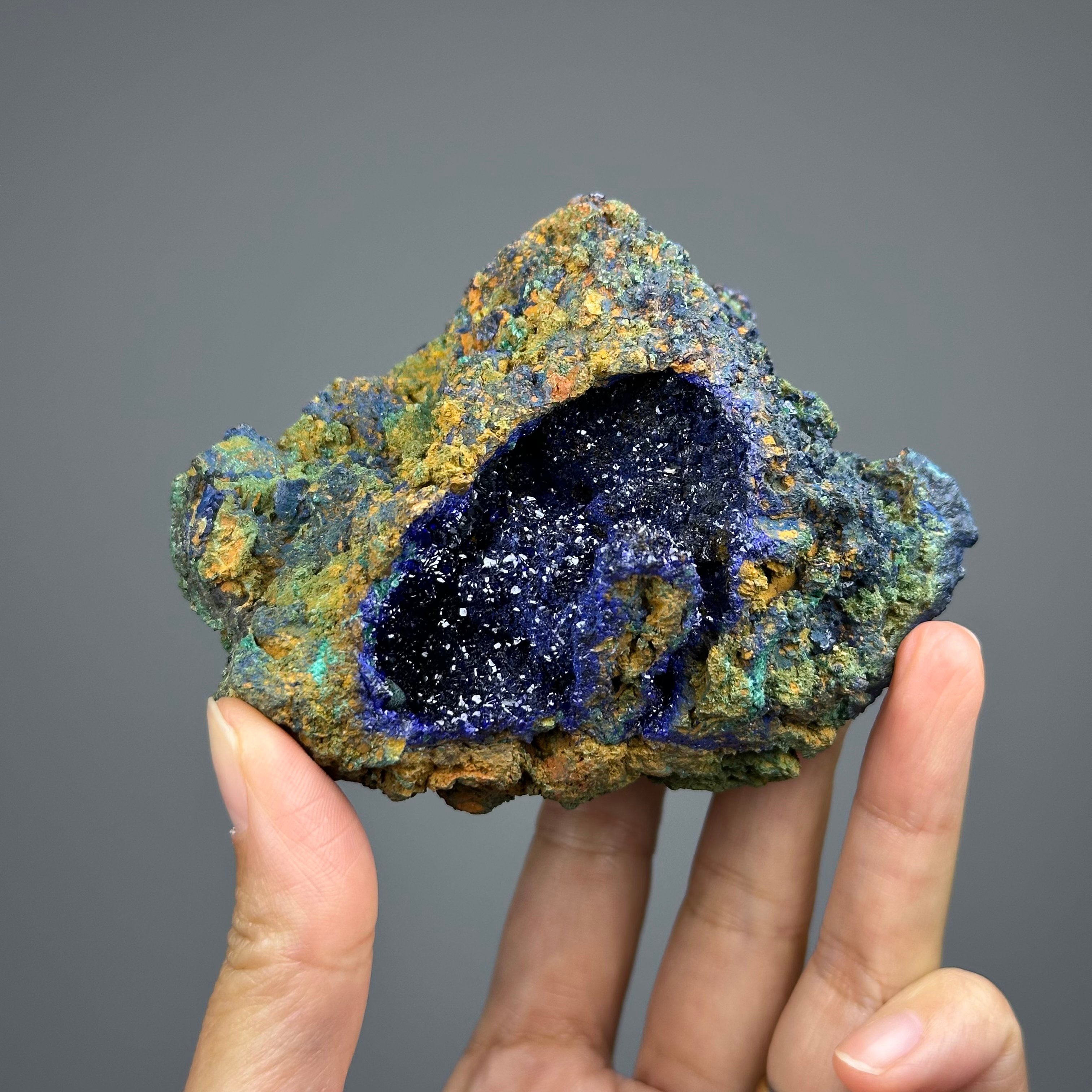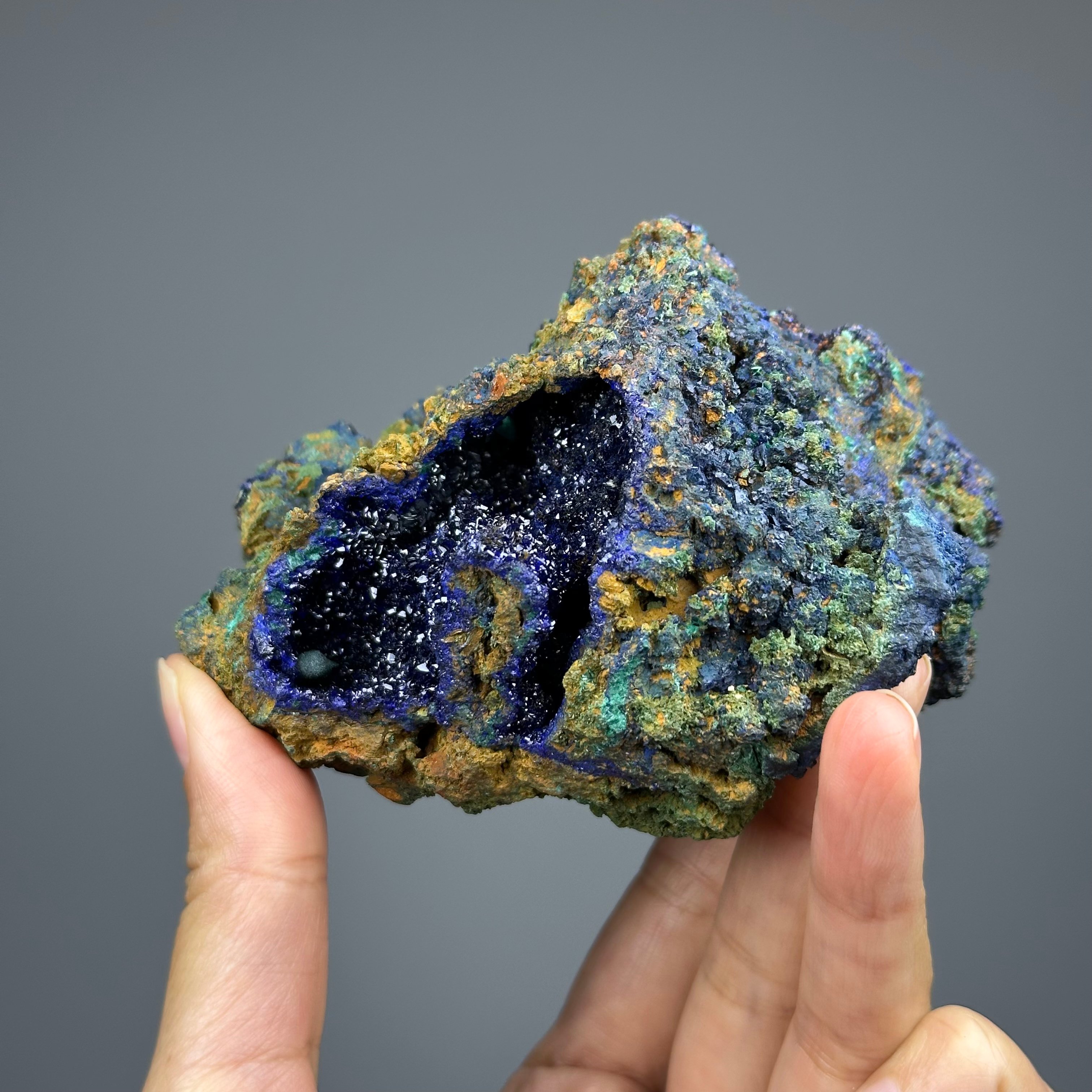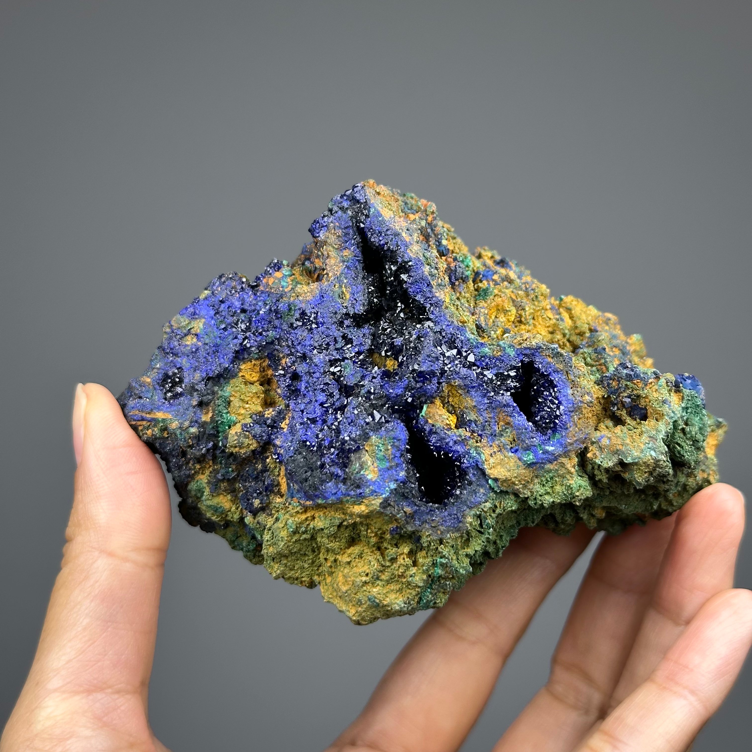 Locality: Laos - 老撾 · 【關於礦物】 名由:Azurite和天藍色Azure都來源於阿拉伯語的藍色 莫氏硬度:3.5-4 顏色:天藍色、深藍色至淡藍色 晶系:單斜 【象徵意義】 - 激活眉心輪(第三眼),幫助精神指導 - 帶來新的視角,拓展思維 - 消除壓力、擔憂和悲傷 _____________________________ 藍銅礦(azurite)是一種常見的含銅礦石,其名稱源於其深藍色的外觀。它是一種銅碳酸鹽礦物,化學結構為Cu3(CO3)2(OH)2。藍銅礦的顏色吸引了人們的注意,使其成為經常用於裝飾和藝術品的材料。 藍銅礦的產地非常廣泛,可以在世界各地的銅礦區找到。它通常與其他含銅礦物一起出現,例如綠松石和黃銅礦。藍銅礦的形成與氧化銅礦床中的含銅流體和地下水的作用有關。 藍銅礦在古代就已經被人們使用。古埃及人、古希臘人和古羅馬人都使用藍銅礦來進行藝術裝飾和顏料製作。它在中世紀歐洲的繪畫中也有廣泛的應用。藍銅礦的深藍色使其成為一種受歡迎的顏料,被稱為「天藍色」。 除了作為顏料和裝飾材料,藍銅礦還被用於製造銅。通過將藍銅礦經過熱處理,可以將其轉化為純銅或銅礦石。藍銅礦也被用於製造製導電銅和其他銅合金。 然而,由於藍銅礦中的銅含量相對較低,因此在現代銅礦業中並不常見。現代的銅開採主要集中在高銅品位礦石的開發。儘管如此,藍銅礦仍然受到礦物學家、收藏家和藝術愛好者的喜愛,並繼續在藝術和文化領域中發揮重要作用。 總結來說,藍銅礦是一種常見的含銅礦石,以其深藍色而聞名。它在藝術和裝飾領域中廣泛應用,並且在古代和中世紀的文化中佔有重要地位。儘管在現代銅礦業中並不常見,但藍銅礦仍然受到人們的喜愛,並持續在礦物學和藝術領域中發揮著重要作用。